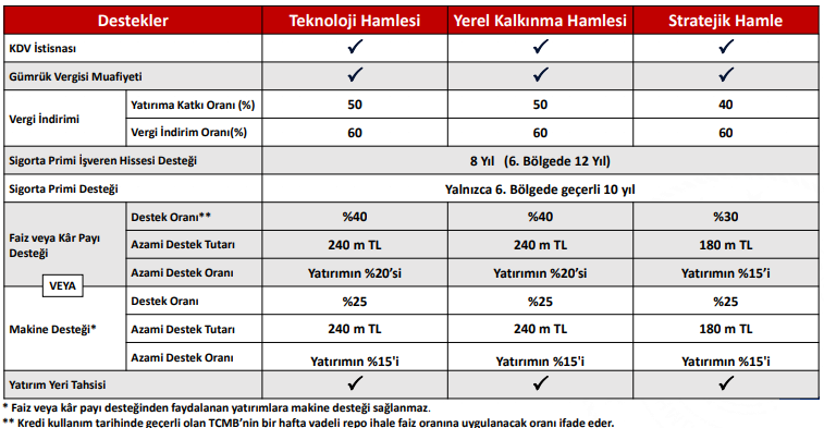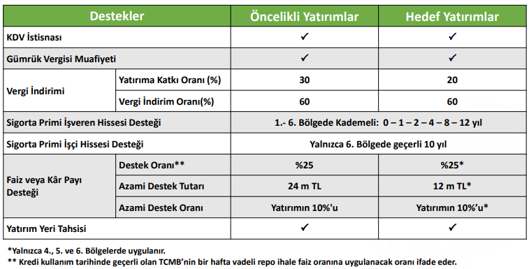Bu amaçlara ulaşmak için Türkiye’nin yatırım teşvik sistemi çok çeşitli mali ve operasyonel destekler sağlamaktadır: